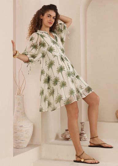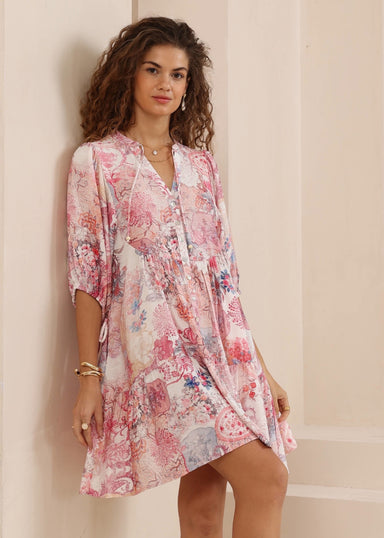 The DANDI MINI DRESS brings effortless elegance with its artisan print and relaxed silhouette. Featuring a flattering V-neckline with neck tie deta...