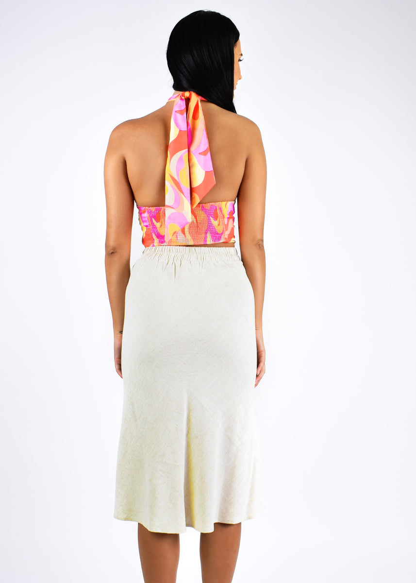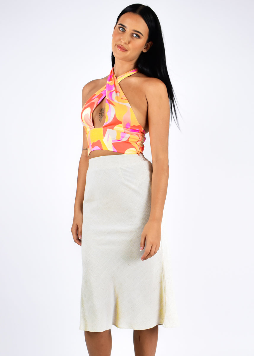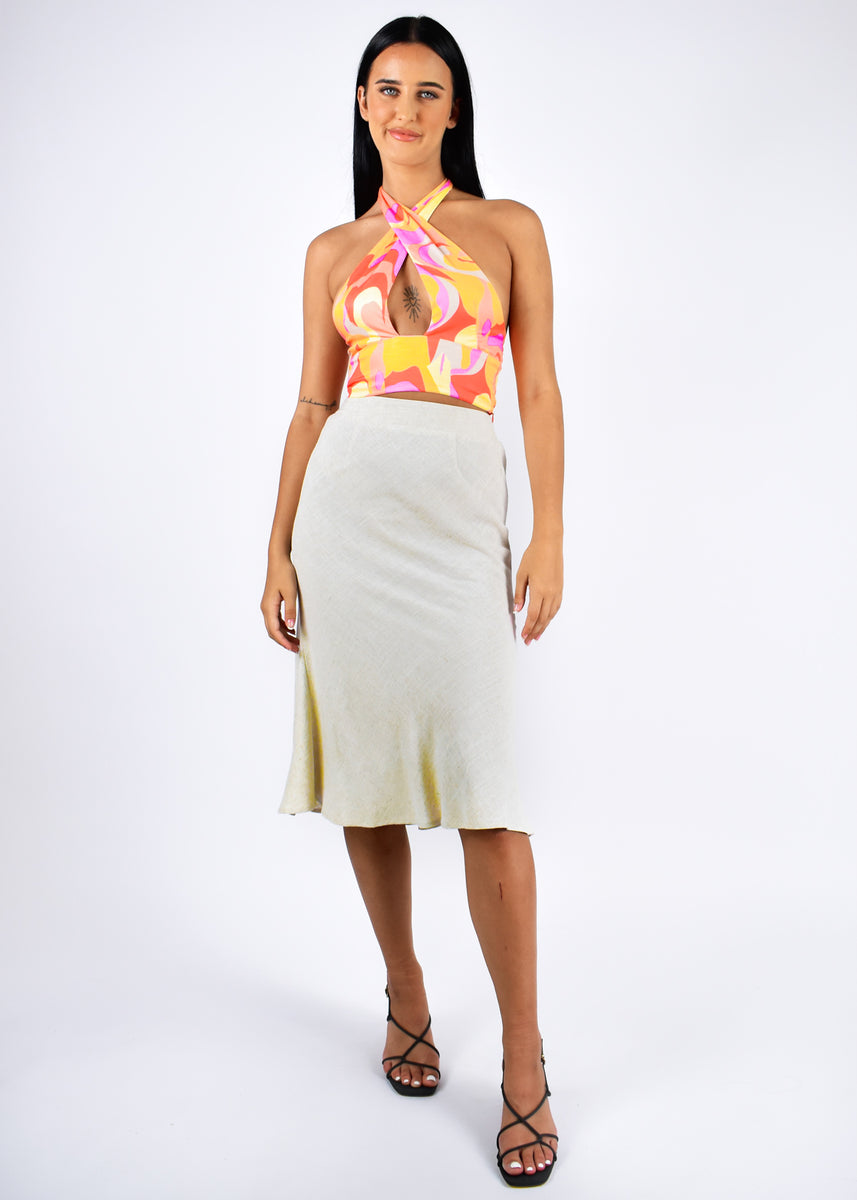The Tenna skirt is the perfect basic to create amazing outfits. Pair with our Zodiac crop and Tan Prin heels by Therapy for the perfect put together fit.