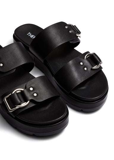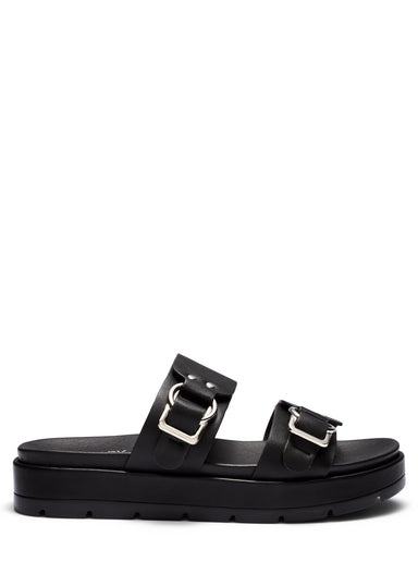 Platform slide with padded straps and toe ring feature Thick leather straps with buckle closure 5.5cm platform with rope feature on a eva sole lea...