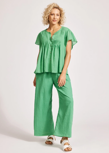Elevate your wardrobe with the ORSULA Button Top in JADE, featuring a relaxed silhouette and stylish pleated shoulder panels. The button-through fr...