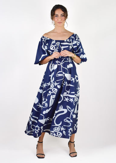 Embrace understated elegance with the Azzurra Off-Shoulder Dress, crafted from a luxurious jacaranda blue linen-blend that drapes beautifully with ...