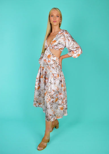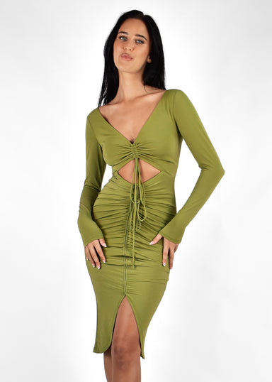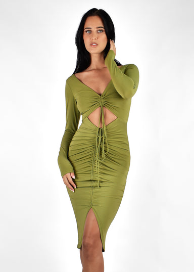 Midi dress Deep V neck Adjustable rouching on bodice and skirt Long sleeved Deep V cut out on back Adjustable tie across back Invisible zipp...