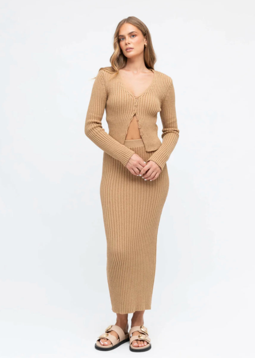 Elevate your winter style with our ARLET KNIT SKIRT. This black knit set is versatile, perfect for both dressy and casual occasions. Featuring a button down design and V-neck, it offers a snug fit in a ribbed fabric that exudes sophistication.  Pair with the Arlet Knit Top and also available in Latte.