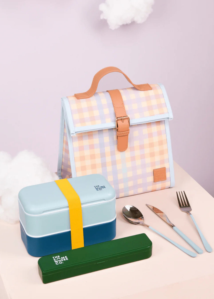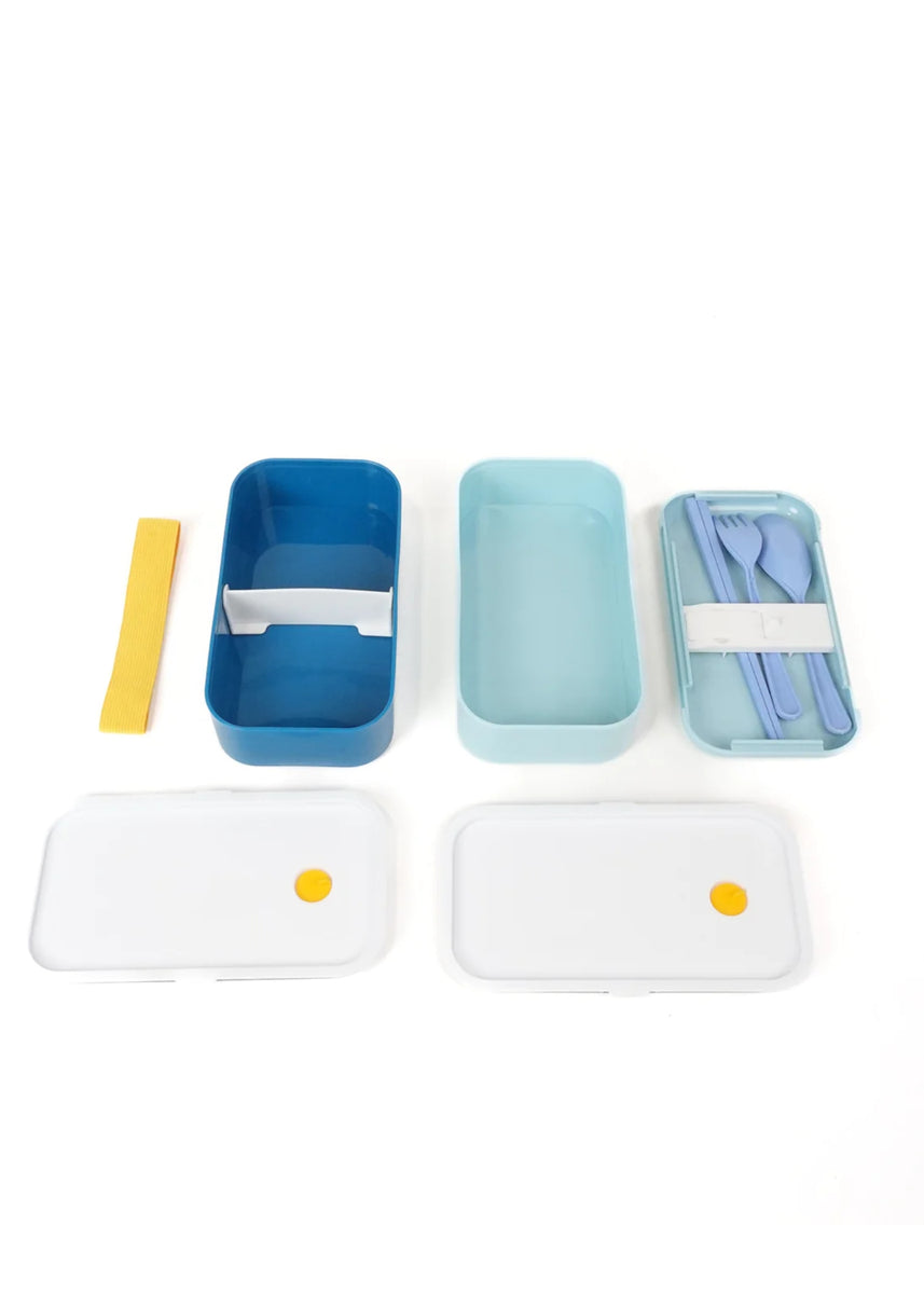 The lid holds a wheat fibre cutlery set, complete with spoon, fork and chopsticks!