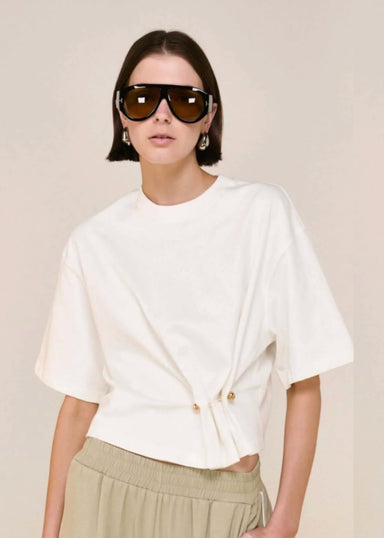 The Lune White Cinched Waist Cotton Tee redefines the everyday essential with a modern, sculptural twist. Designed with a relaxed oversized fit, th...