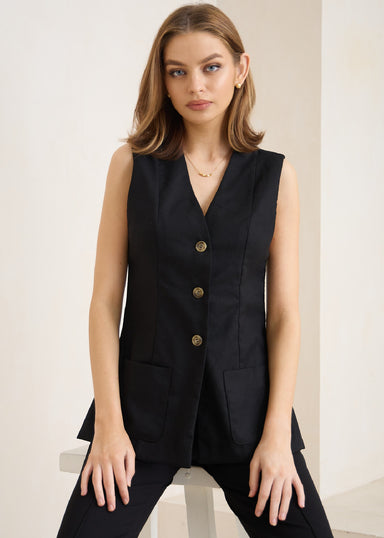 Elevate your wardrobe with the Rhiannon Vest in BLACK, a subtly chic wrap top that offers effortless style. Its tailored fit flatters your silhouet...