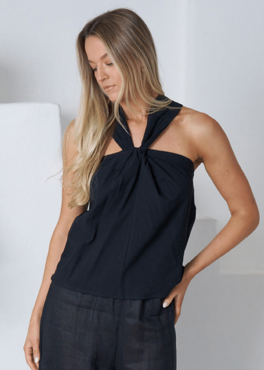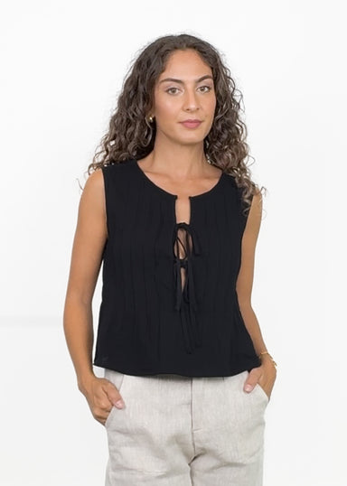 Elevate your everyday wardrobe with the PALU TOP, a versatile black essential featuring a charming front tie detail that adds instant sophisticatio...