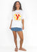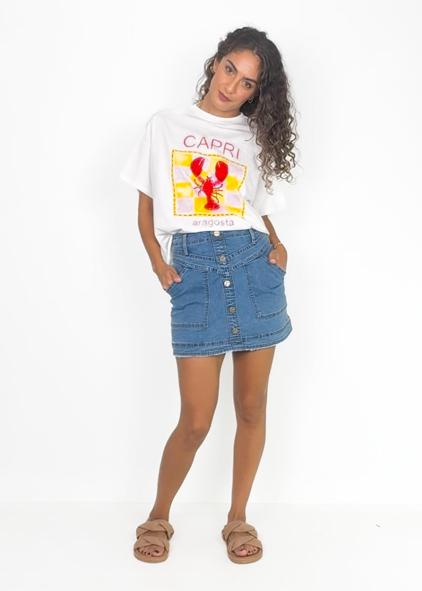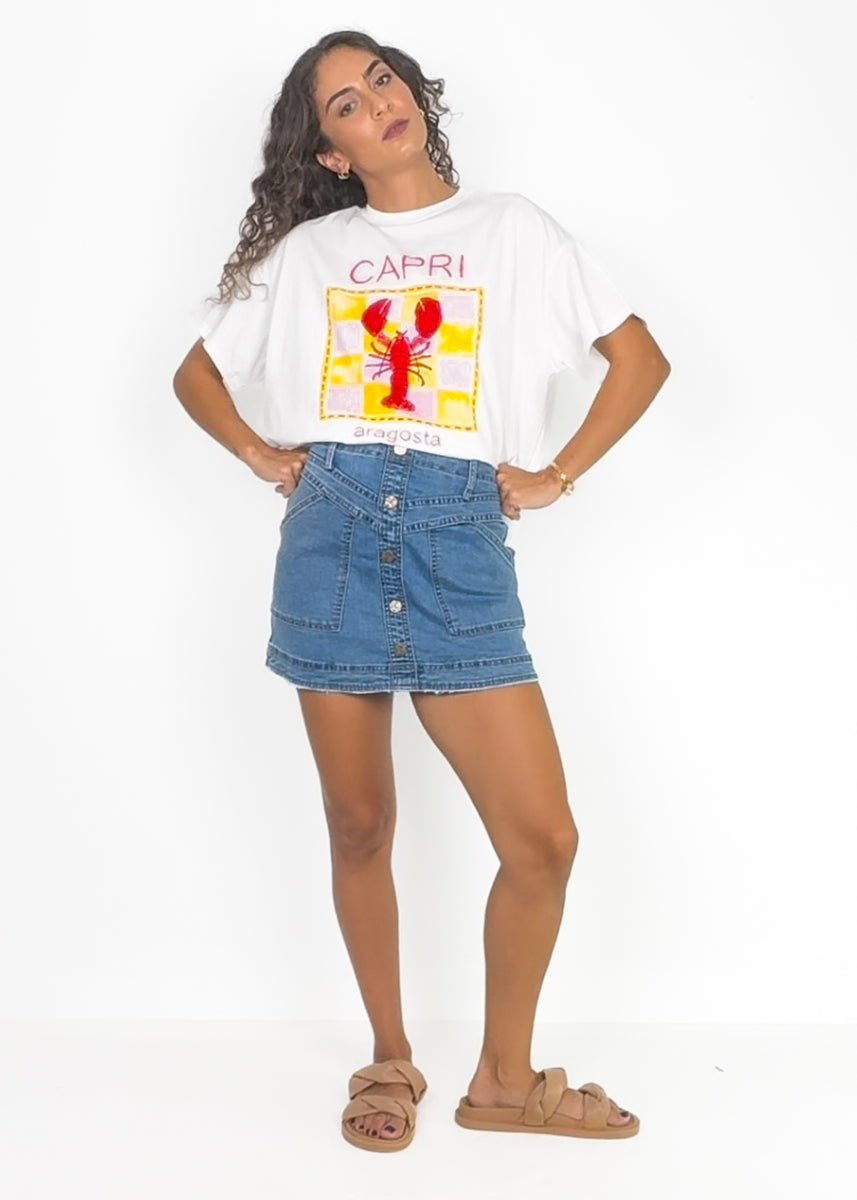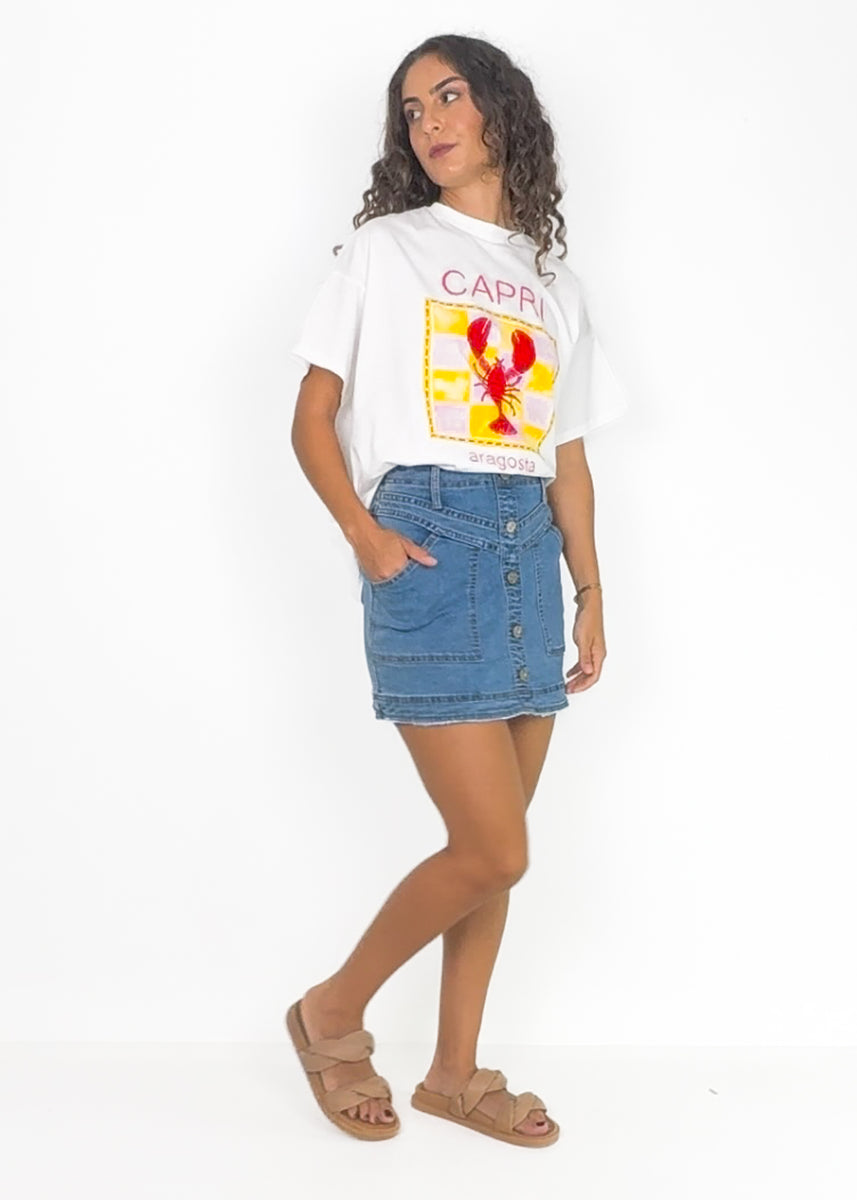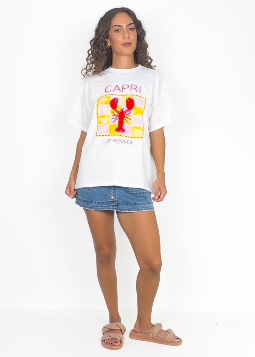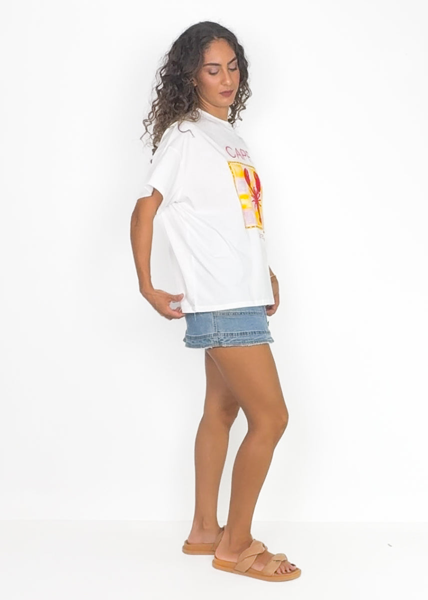 Looking for a fun and trendy t-shirt? Look no further than the CAPRI T-SHIRT! Its playful and stylish print will make sure you stand out in a crowd. Perfect for those who love to make a statement with their fashion choices. Add some flair to your wardrobe with this must-have piece!