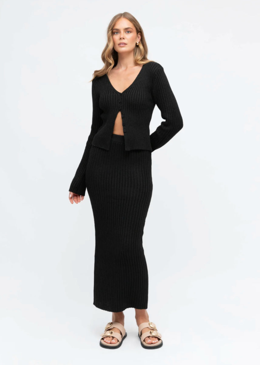 Elevate your winter style with our ARLET KNIT TOP. This black knit set is versatile, perfect for both dressy and casual occasions. Featuring a button down design and V-neck, it offers a snug fit in a ribbed fabric that exudes sophistication. Pair with the Arlet Knit Skirt and also available in Latte.