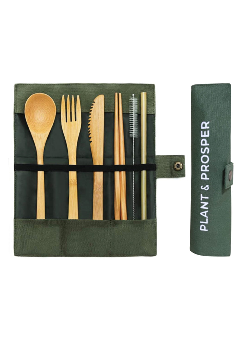 Includes knife, fork, spoon, chopsticks, bamboo straw, straw cleaner