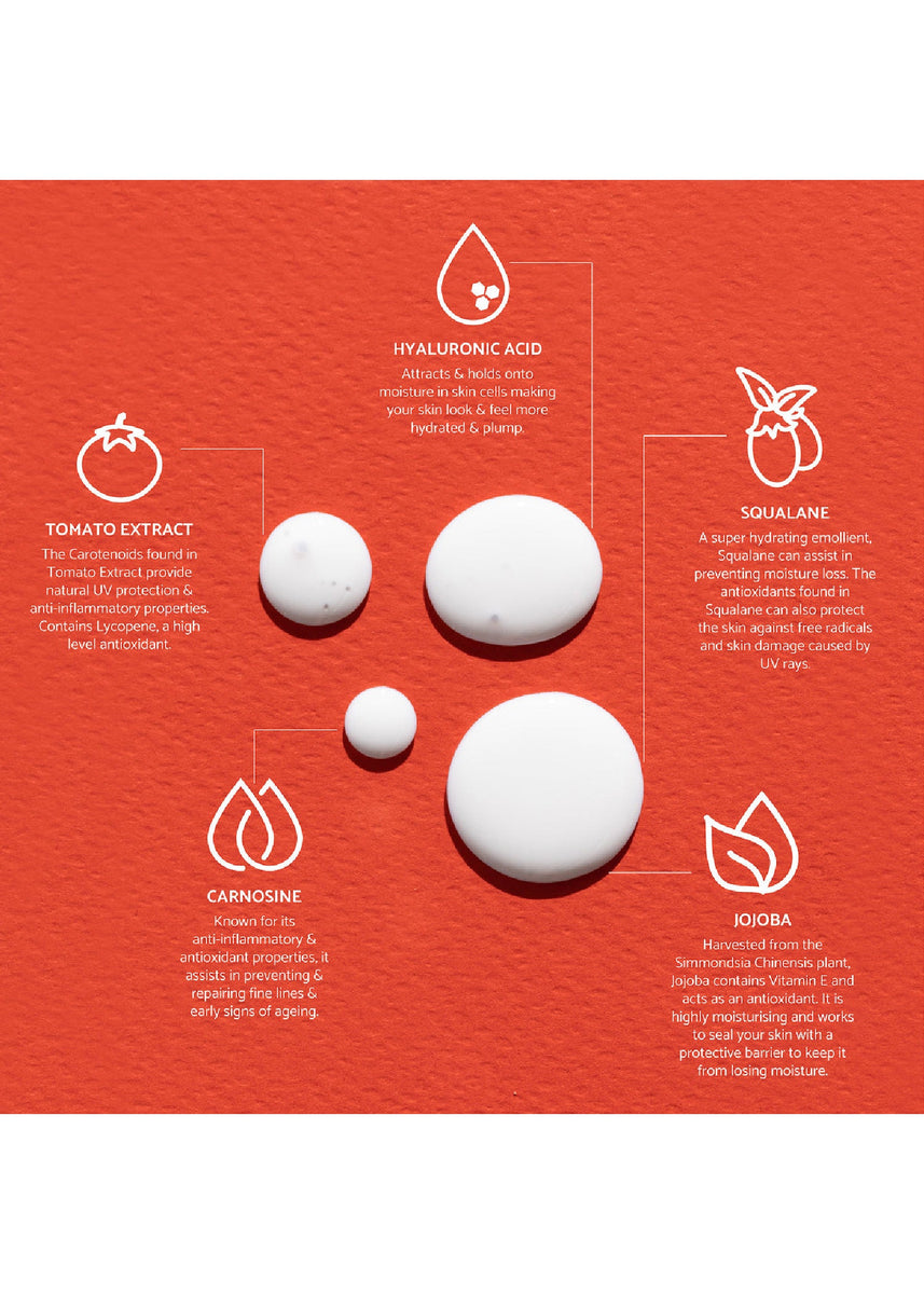 Wake up with Good Morning SPF 50 FRAGRANCE FREE to help protect, restore and hydrate your skin while you focus on the fun stuff. Daily protection from the damaging effects of sunlight and environmental pollutants. With added Solanum Lycopersicum (Tomato Extract), Carnosine, Hyaluronic Acid, Simmondsia Chinensis (Jojoba) and Squalane.