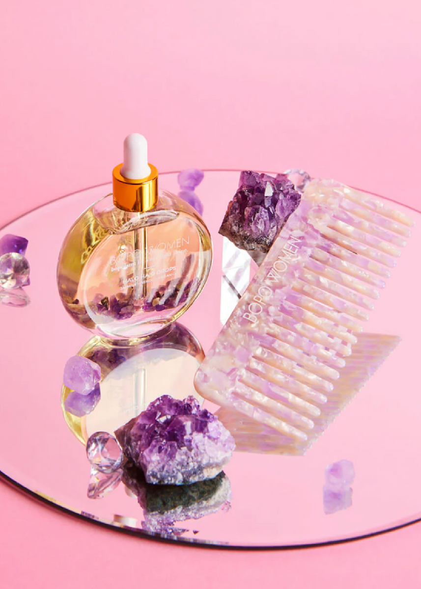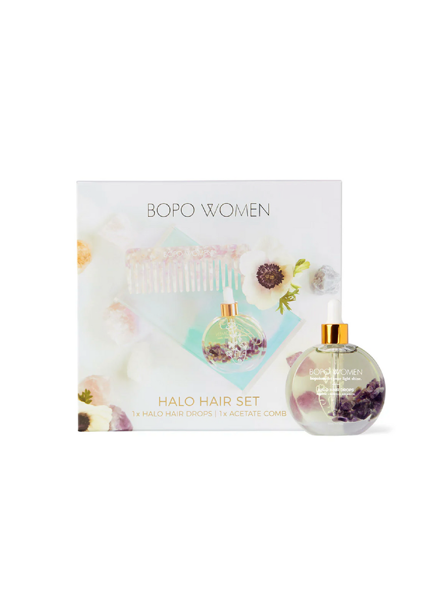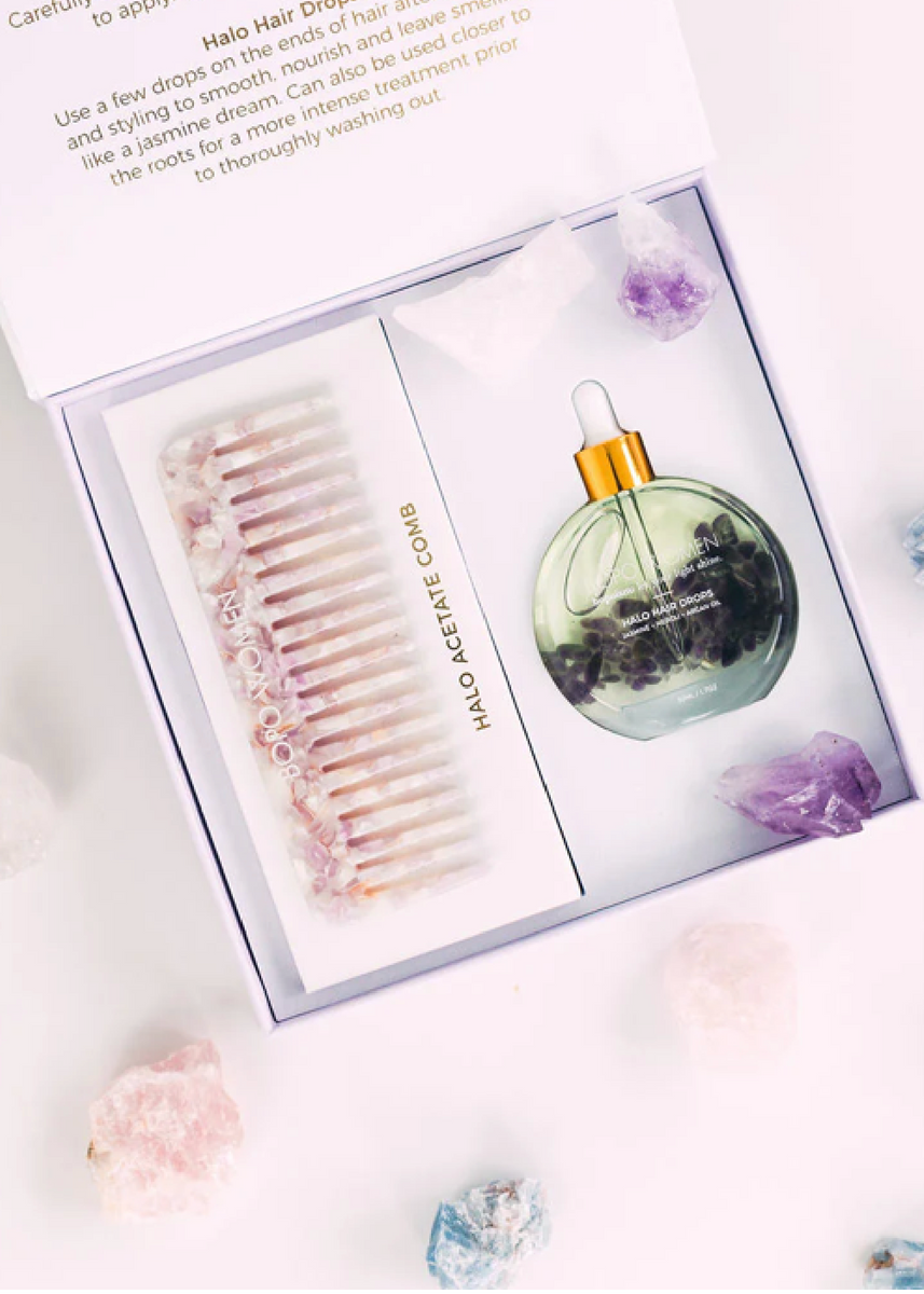 Indulge in our Halo Hair Set, featuring our Halo Hair Drops and an eco-friendly acetate comb, elegantly presented in a luxurious gold foil gift box. Our nourishing hair oil, infused with jasmine absolute, neroli, grapeseed, and argan oil, will leave your hair feeling strong, shiny, and smooth. Suitable for all hair types, this lightweight oil is naturally derived and free from parabens, sulfates, and pthalates. The exquisite acetate comb, designed with a lovely lilac tortoise shell pattern, is crafted from high quality, plant-based Acetate and comes with a convenient lilac gold foil pouch for storage.