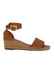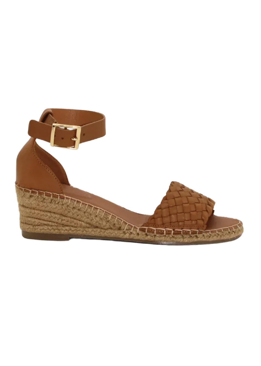 - Woven leather sandal with an ankle strap on an espadrille wedge