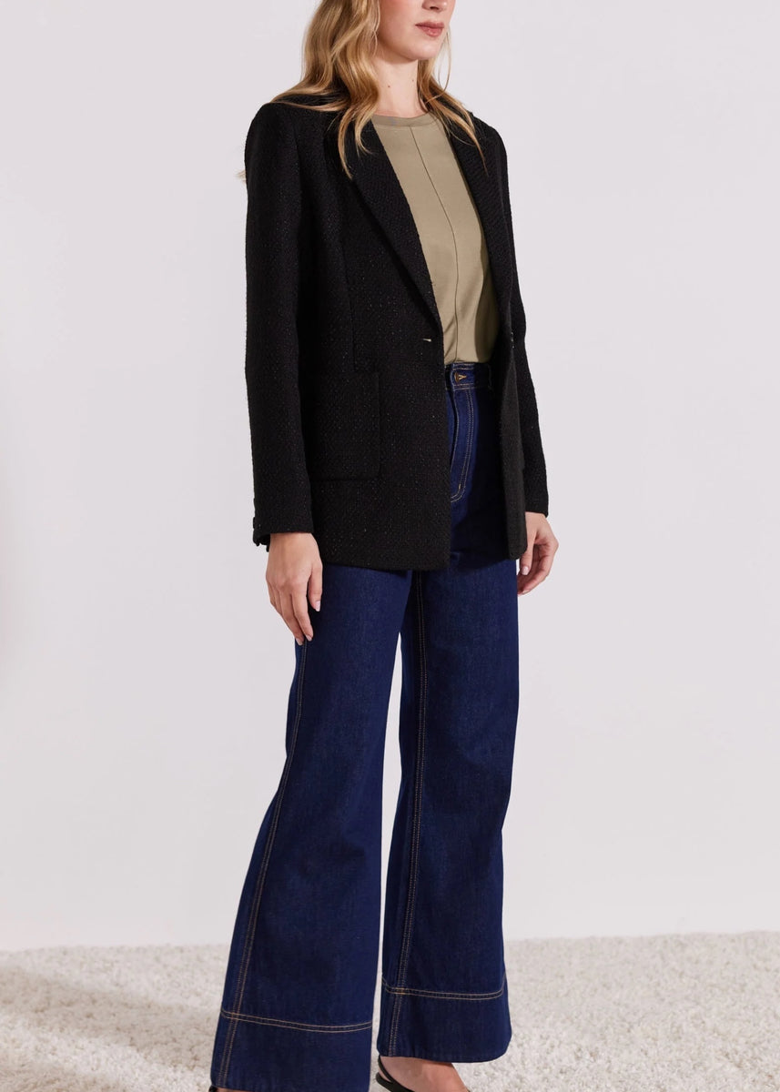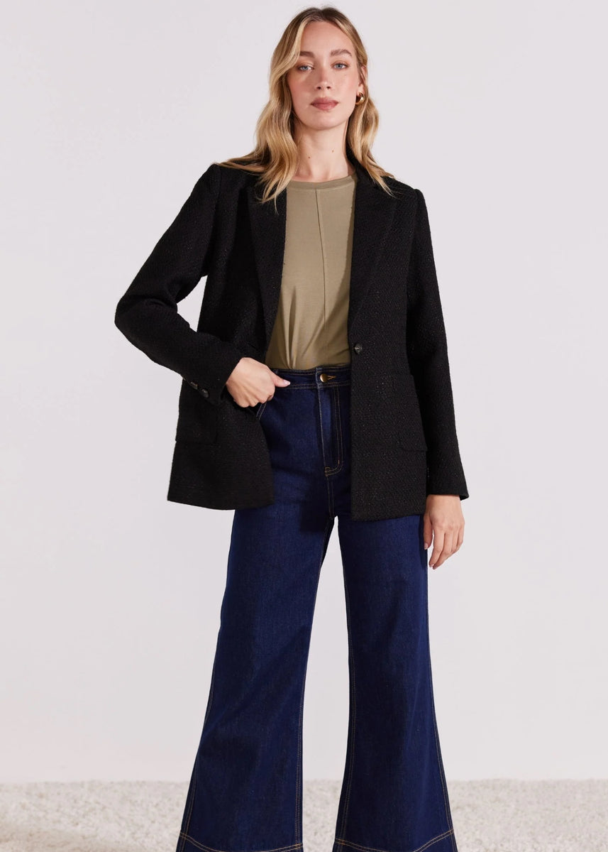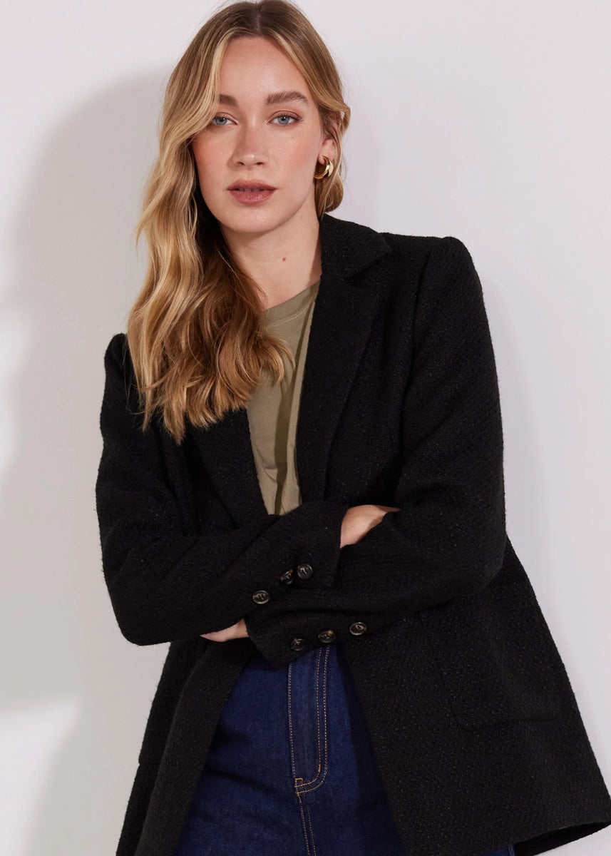 The GABRIELLE BOUCLE BLAZER is a must-have for any fashion-forward office wardrobe. Its textured design is sure to make a statement while also remaining appropriate for any professional setting. Its modern silhouette provides both style and comfort for long days at the office.