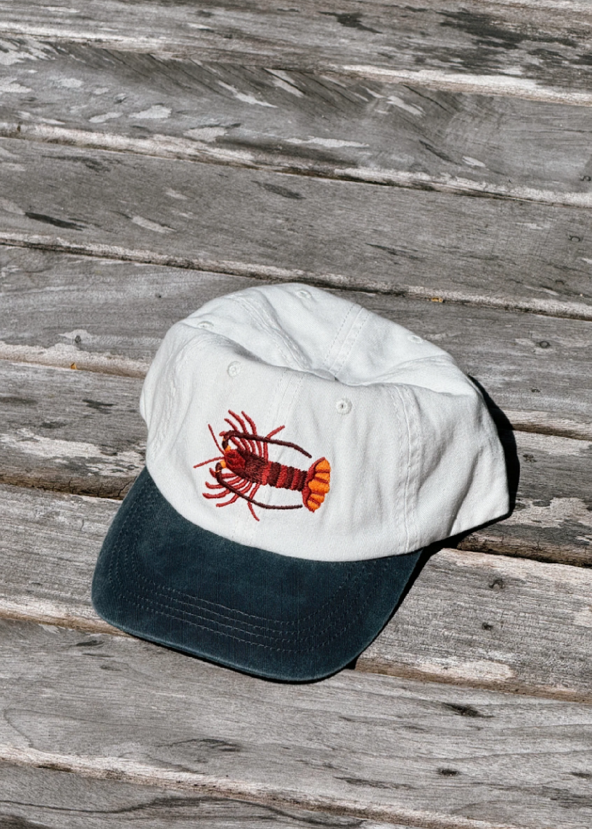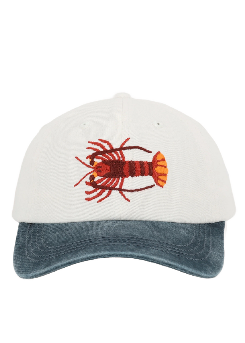 The Southern Rock Lobster (Jasus edwardsii), also known as crayfish or spiny lobster, is a delicacy of the southern oceans and a favourite among seafood lovers. This cap, with its white top and stone blue brim, showcases the striking silhouette of this iconic crustacean, a true representation of Australia's coastal bounty.
