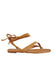 - Two tan straps wrap the foot before extending upwards to secure the ankle and finish with a bow