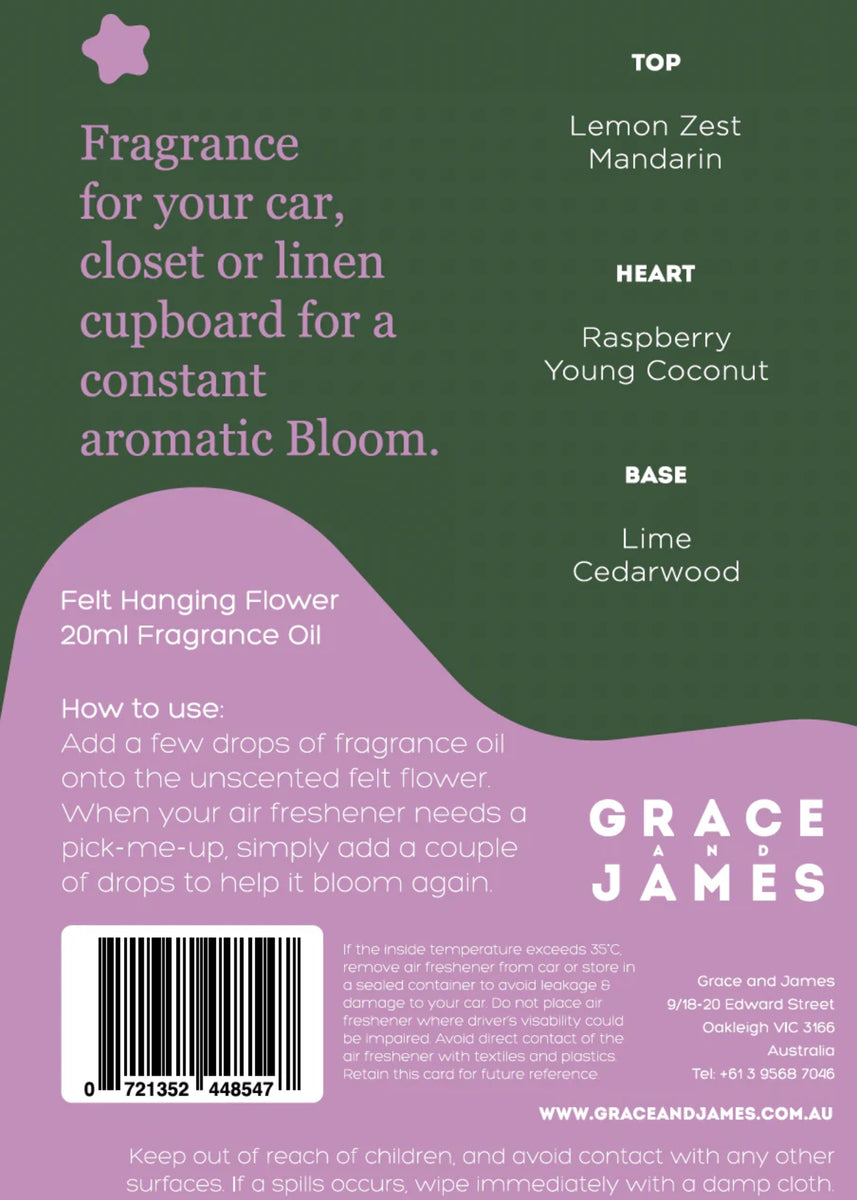Fragrance for your car, closet or linen cupboard for a constant aromatic Bloom. Indulge in the captivating scents from the Bloom Collection with this reusable air freshener from Grace and James. Perfect for your car, closet, or linen cupboard, this sustainable product will provide a constant aromatic bloom to enhance any space.